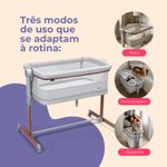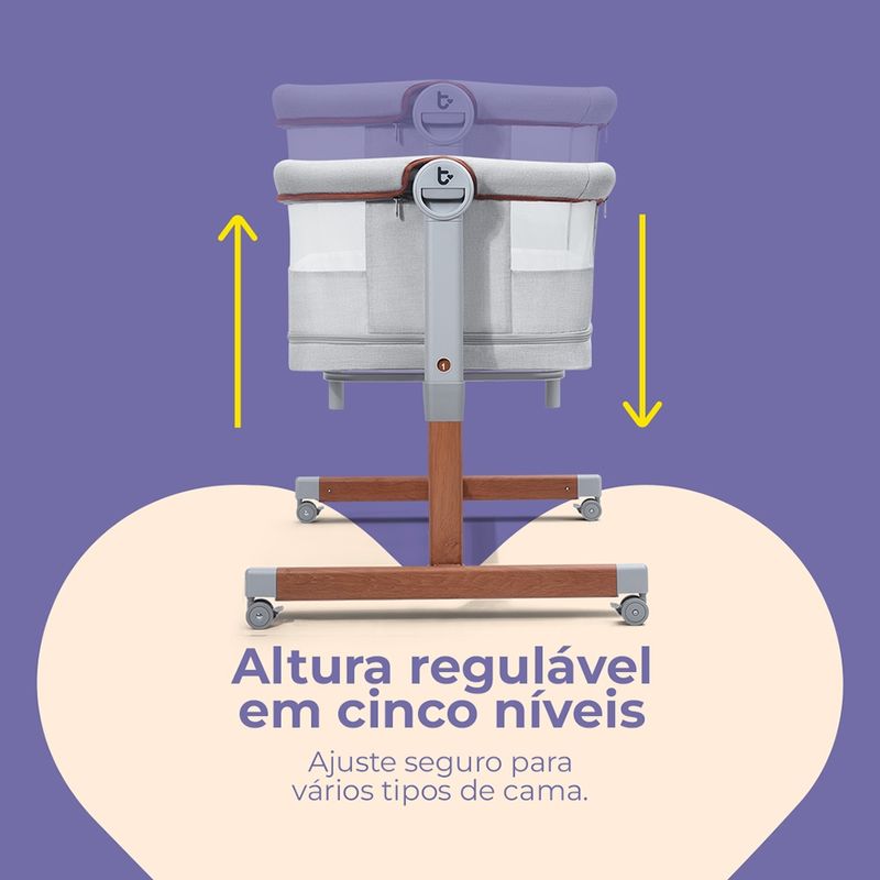 - Co-Sleeping (Lado a Lado): Com 5 ajustes de altura e sistema de fixação, acopla-se perfeitamente à cama dos pais, facilitando a amamentação e o cuidado noturno.
